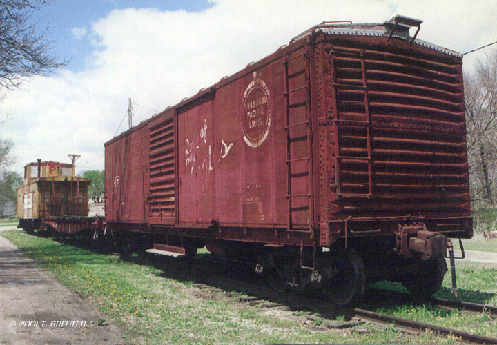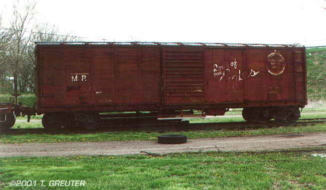 MP 15157 - One of Mopac's unique tool cars that once served a brief career in Express Mail service, seen on a service track at Nehawka, Nebraska; 5/19/01 - Todd Greuter photo See MoW Part 3 for more on these ex-Express cars. |