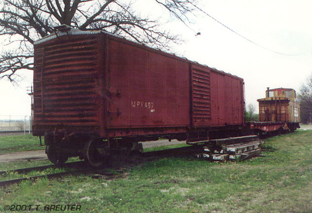 MP X 297 - This tool car's original reporting number has been shortened to three digits. The ex-box car is coupled to MP 992 and an old-timer U.P. caboose. Falls City, 5/3/97 - Todd Greuter photo |