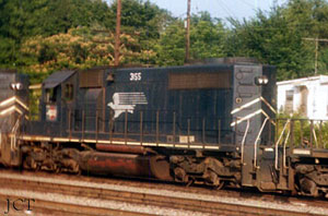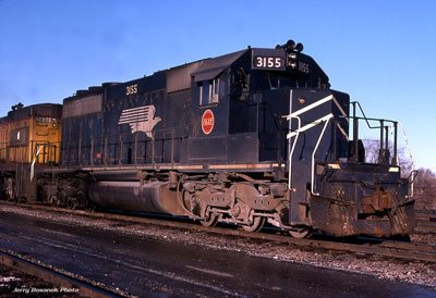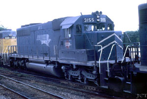 & Eastern Illinois (MP) SD40-2 Unit #3155 How much can be said about just one SD40-2, one typical example of the best power the Missouri Pacific Railroad had to offer? Let's try to unfold one life story, the story of C&EI #3155. Let's begin with the beginning. The EMD assembly plant in LaGrange, Illinois was the company's only manufacturing facility for many years. All EMD diesels were built here until the early 1980s. The London, Ontario plant is the primary plant nowadays. LaGrange still plays a role, though somewhat dimished, with sub-assembly, painting, and the like. In early 1974, one-dozen skeletal Dash 2 forms took shape: starting from the rails up were two sets of three axled HT-C trucks, the curved fuel tank (capacity?), the largest bulk of the body was made up of a powerful prime mover based on the proven 16-cylinder 645E3 power plant. Builders swarmed over the unit to install wiring, plumbing, fans and vents. After the hood was lowered over the powerplant, access doors, windows, controls. The biggest milestone of final assembly is when the 40-2 unit is finally "trucked" - when the body is lowered onto the wheel assemblies. All came together into individual diesel-powered locomotives. Finally a worker riveted to the side sill a metal tag designating her as number 73748-17, built in March 1974, 3000 horsepower; high traction C-C trucks; 391,000 pounds operating weight. The newest and brightest in a steller line of rail power - she was an EMD SD40-2 class locomotive. Her initial assignment wouldn't be far from her birth place, she'd be delivered to Mopac subsidiary Chicago & Eastern Illinois, as their #3155, part of the C&EI #3150-63 order which completed her roster (some sources list C&EI's complete SD40-2 order included units #3139-3163, others list only the 14 unit order as going to the company). These were the first new units purchased for the company since MoPac control, the first C-C power the road would own. * * * She wouldn't be alone, as #3155 and her fourteen sister units would join a powerful SD fleet. The EMD-built SD40-2's put into service by the Missouri Pacific where the prefered road power of the railroad. They weren't flashy (save for a very imposing bird of prey on each flank) or even outfitted with dynamic brakes (the MoPac was a flatlander railroad with low profiles, and the engineering department chose against the expense of installating DB's). However these units were easy to maintain, smooth to operate, achieving high speeds, had lots of traction and plenty of muscle when it was needed. The Dash 2 became the standard throughout the 1970s and '80s. Unit #3155 arrived in time to receive the MoPac's new four-digit numbering that had just been adopted to accomodate a re-newed roster swelled with the additions of new SD locomotives and other merged motive power in 1974-75. The 3100-series was reserved for the SD40-2, representing it's 3000 horse power rating. She was delivered in standard "Jenks Blue" with 3-inch wide scotchlite strips and 8-inch numbering. Incidentally, the final unit of the order, #3163 was delivered in the new large number scheme, unlike her sisters with the "turbo eagle" on the long hood. Who was her first road crew?... What was her initial assigment on the old C&EI? We will never know, unless those parties involved should confess. We can safely assume that without ceremony she was inducted into her maiden assignment. An inconspicious crew van would pull up and dislodge a train crew fresh for the road... the legendary Engineer and Brakeman... and in the good old days this would also include the revered Conductor and Flagman who would man the vermillion red caboose at the end of the long train. The road crew would have been your average Joes, just doing their job. The loco's crewmen would grab #3155's railing, climb up the steep steps and squeeze into the cramped quarters of the gray crew cab (why did the railroads coat the inside of everything gray?), stow their carry-ons, or "grips" as they were called and begin checking out the sheets of orders as they waited and waited upon a favorable signal that their train was clear to proceed. One way to bide time was to discuss the topics that you'd expect railroaders to discuss during the wait, pouring coffee from a thermous and sipping the still-warm brew. Another way was to go through your routines. The Brakeman had his own ritual. He would duck through the doorway behind the Engineer's seat and step out on the 2-foot wide decking of the long hood to check things over - confirm the MU connections weren't loose and open the panel doors to ready the massive prime mover inside. Meanwhile the engineer took his place at the Dash 2's control stand, sat on the somewhat stiff vinyl seat (unfortunately for this road crew, MoPac opted for strict functionality - not comfort). It can be joked that the crew cab is sort of a haven for the seasoned railroad man. Here amongst the noise, vibrations and fumes in the confines of his spartan haven, settled happily on a soon-to-be worn seat, under the soles of his shoes he feels the rejuvenating vibration of power at his call, hearing the living-breathing sounds of valves popping, pumps pumping, and the pulsing rise and fall of a diesel whine, shrill but throaty at the same time... on this day it is one of the last refuges where one can flee for the inner self. * * *