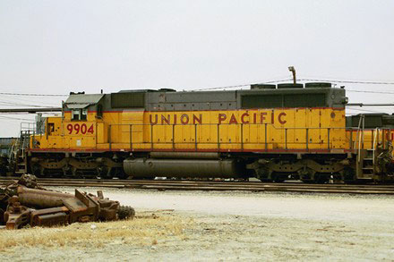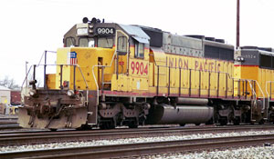* * And now a final update... is it the end of the line? What a difference 12 months can make. The UP 9904 was sold at an auction in North Platte, Nebraska on December 9, 2003 to an unknown buyer. Her condition is unknown, but she was seen to be in very bad shape, after apparently being cannibalized. Several parts were missing and the traction motors were shot. We don't have an official retirement for her in 2003, but the 9904 (3155) joined 11 other former Mo-Pac SD40-2s that were also sold on the same day. It is hoped that these engines that were once the power of the Missouri Pacific have still been saved from the scrapper and found new rails to call home, but it seems doubtful.
