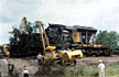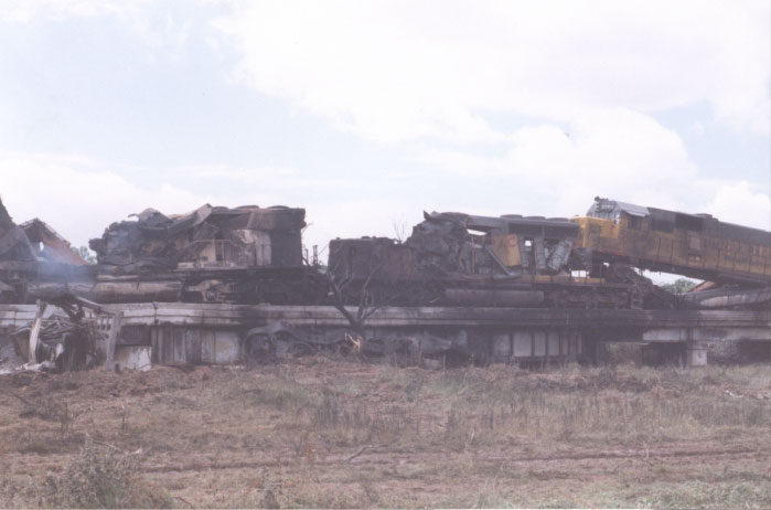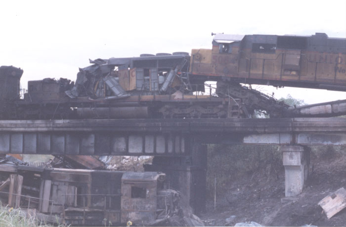 The remains of the UP 4211 are temporarily set back on its trucks and moved out of the way to a service track about 1/2 mile away. The prime mover of the 4211 was removed, and the remainder of the locomotive was scrapped on site about a week later. -Jay Glenewinkel Photo |