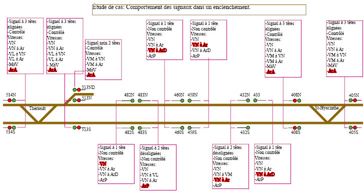 La vitesse entouré de rouge est la vitesse que le signal affiche par défaut lorsqu'aucun train n'est présent, ET qu'aucun itinéraire n'a été libéré par le CCF. Les exemples ont été écrits de façon à être lu dans l'ordre. Introduction: L'enclenchement ci-haut représente une portion de la subdivision de St-Hyacinthe du CN. Le territoire est contrôlé selon la Commande Centralisée de la Circulation, par un CCF posté à Montréal. La subdivision est en voie double, et les voies sont signalées dans les deux sens. Cependant, la pratique courante veut que les trains en direction est circulent sur la voie sud (au bas de l'écran). Aspects par défaut, et interaction des signaux.: Les signaux 482N, 482S, 460N, 460S et 433 sont des signaux de canton (bloc signal). Ils ne sont pas contrôl;é et n'apparaissent pas sur l'écran du CCF. Comme les enclenchements de Thériault et de St-Hyacinthe sont séparé de X milles, on a segmenté la portion de voie entre ces deux points afin de pouvoir y faire plus de trains. Pour assurer une protection minimale, on a mis des signaux de canton. L'aspect d'un signal de canton dépends directement de la condition de la voie (occupée ou pas) et du signal suivant. Si on analyse les signaux de la voie sud en partant de St-Hyacinthe, le signal 408 montrera certainement un aspect d'arrêt absolu, puisqu'il est enclenché et qu'il protège la liason double de St-Hyacinthe. La signal 432S est le signal d'approche du signal du signal 408S. Son aspect par défaut est vitesse normale à arrêt, étant donné que le signal 408S montre un arrêt absolu. Le signal 460S donne un vitesse normale à arrêt différé. On aurait pu penser que ce signal donne un vitesse normale. En fait, la raison du vitesse à arrêt différé est causé par le fait que la vitesse autorisé sur ce tronçon de la subdivision est tel que le plus gros autorisé à circuler sur cette subdivision (plus de 10 000 tonnes) ne pourrait s'arrêter sécuritairement dans la lngueur comprise entre deux signaux. On doit lui donner un signal d'arrêt différé, qui est ni plus ni moins qu'un signal avancé d'arrêt. Le signal 482S donnera une indication de vitesse normale. Le signal 514S est le signal de la liaison double de Thériault. Il est donc contrôlé par le CCF est affiche un arrêt absolu par défaut. -- Prenons la situation où le CCF demande de libéré la voie sud à St-Hyacinthe. Comme le train ne prendra pas la liaison et que le voie est libre, le signal 408S affichera vitesse normale. En supposant qu'aucun autre n'est dans le territoire, le comportement du signal 408S fera en sorte que les signaux 432S, 460S et 482S donneront l'indication de vitesse normale. Au fur à mesure qu'un train progressera, les signaux afficheront leur indication la plus restrictives (arrêt absolu ou permissif). Une fois que le train aura libéré le canton d'un signal, celui attendra que le signal suivant change pour donner une indication de moins en moins restrictive, jusqu'à revenir à son indication par défaut. Par exemple, le 482S donnera un arrêt absolu dès que le train l'aura franchit, puis donnera une indication de vitesse normale à arrêt lorsque le train aura complètement franchit le signal 460S (et donc libéré le canton du signal 482S). Il donnera l'indication de vitesse normale à arrêt différé lorsque le train aura franchit le signal 432S (la signal 460S devenant un vitesse normale à arrêt), puis reprendra son aspect de vitesse normale lorsque le signal 408S sera complètement franchit (car le signal 432S indiquera vitesse normale à arrêt, le 460S donnera vitesse normale à arrêt différé). -- Si un train suivait de près (c'est-à-dire dans le canton immédiatement derrière le canton occupé par le premier train), celui-ci rencontrerait des signaux donnant vitesse normale à arrêt, ou même d'arrêt permissif (n'oubliez pas que le train peut franchir ce signal après avoir fait un arrêt complet et en procédant à vitesse de marche à vue). -- Prenons maintenant l'exemple où le CCF voudrait faire passer un train de la voie sud à la voie nord à la liaison de St-Hyacinthe. Puisque les aiguillages de liaison de St-Hyacinthe ont une vitesse maximale de 30 m/h, le signal 408S donnera une indication de vitesse moyenne à vitesse normale (en supposant que la voie est libre, et que le signal suivant indique vitesse normale ou vitesse normale à quelque chose). Son signal d'approche, le 432S indiquera vitesse normale à vitesse moyenne. Puisque le signal 432S indique d'abord vitesse normale, tous les autres signaux (460S et 482S) se comporterons comme le premier exemple discuté, et afficheront vitesse normale. -- Les signaux de la liaison de Thériault se comportent de façon identique à ceux de St-Hyacinthe, sauf que les aiguillages ont une vitesse de 45 m/h, ce qui fait que l'indication de vitesse moyenne est remplaçé par une indication de vitesse limitée. -- Les signaux 514N, 514S, 408N et 408S peuvent aussi donné une indication de marche à vue, car sur les cantons contrôlé par ces signaux il y a des aiguillages menant à des voies non signalées. Pour les signaux 514N et 514S, il s'agit de la cour de triage de l'AMT. Pour les signaux 408N et 408S, il s'agit de la voie menant au chemin de fer MMA. -- Les signaux de canton du schéma étudié portent tous la plaque R. Cette plaque modifie l'aspect d'arrêt permissif en marche à vue (Restricting). Le train n'est pas obligé de faire un arrêt complet lorsque le signal est rouge, mais doit le passer à vitesse de marche à vue et conserver cette vitesse jusqu'au signal suivant. -- Comme le signal 513D contrôle la sortie d'une voie de triage et qu'il mène uniquement à un aiguillage qui ne peut autrement que talonné, il ne pourra indiquer vitesse normale. Il donnera une indication de vitesse moyenne à vitesse normale dans le cas où la voie est libre et le signal suivant (qu'on ne voit pas sur le schéma) indiq