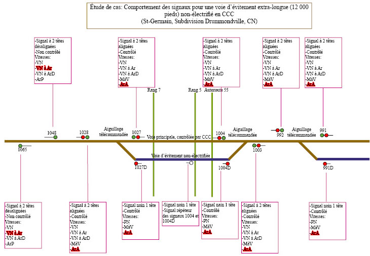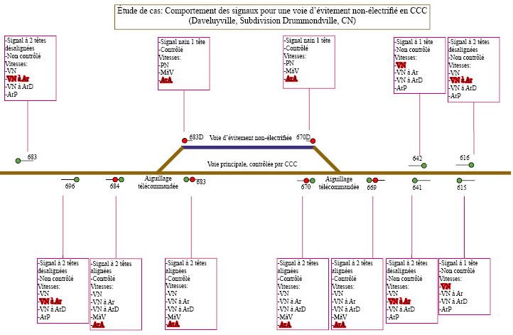 Introduction: Le schéma ci-haut représente une voie d'évitement standard. Celle que nous étudirons est celle de Daveluyville, sur la subdivision Drummondville du CN. La voie principale est de couleur brune, alors que le voie d'évitement est bleu. La voie d'évitement n'est pas électrifié. Le système n'a donc aucun moyen de vérifier si la voie d'évitement est occupé ou non. Nous verrons dans l'analyse comment le système de CCC peut afficher une train dans une voie d'évitement non-signalé. Le territoire est contrôlé selon la Commande Centralisée de la Circulation, par un CCF posté à Montréal. Aspects par défaut, et interaction des signaux.: Les signaux 684, 683, 670, 669, 683D et 670D sont des signaux contrôlés par le CCF. Les signaux 696 et 641 sont des signaux d'approche de la voie d'évitement. Les signaux 683 et 616 sont des signaux d'approche de d,autre voie d'évitement qui ne sont pas montré sur ce schéma. Les autres sont des signaux de canton. Prenons l'exemple d'un train voyageant vers l'est (vers la droite de l'écran). Lorsqu'auncun train n'est présent, le signal 696 donnera un vitesse normale à arrêt, puisque le signal qui le contrôle (et qui est le suivant dans cette séquence) est le signal qui contrôle l'entrée de la voie d'évitement et donne un arrêt absolu. -- Supposons que le CCF veut permettre à un train de poursuivre sa marche sur la voie principale. Il devra demander un aspect de voie libre aux signaux 684 et 670 (puisque ces signaux contrôle la marche des trains là où il y a un aiguillage) et s'assurer que les aiguille à chaque bout de la voie d'évitement sont orienté pour la voie principale. Le signal 642 est un signal de canton. Son comportement est identique aux signaux de canton dont nous avons discuté dans l'exemple 1. Son aspect est contrôlé uniquement par l'aspect du signal 616 et l'occupation du canton qu'il contrôle. Le signal 616 dépends du signal contrôlé suivant, que nous ne voyons par sur ce schéma. Lorsque le train progressera dans le territoire, les signaux deviendront rouge au fur et à mesure que le train occupera leur canton respectif, puis se comporteront comme dans l'exemple 1 pour revenir à leur aspect initial. -- Si le CCF veut que le train entre dans la voie d'évitement, il devra orienté l'aiguillage ouest avant de demander la libération du signal 684. Comme le système sait que la vitesse de l'aiguillage est de 15 m/h, il devrait donner une indication de petite vitesse à arrêt. Or, comme la voie d'évitement n'st pas signalé, le système n'a aucun moyen de savoir si un train, un véhicule d'entretien ou un rail rompu est présent dans la voie d'évitement. L'indication sera celle de marche à vue. La marche à vue est une vitesse de 15 m/h au maximum, avec l'obligation de pouvoir s'arrêter en deça de la moitié de la distance de visibilité d'un matériel roulant, d'un aiguillage mal orienté ou d'un rail rompu. Si le signal 684 donnait une indication de petite vitesse à arrêt, cela voudrait dire que le système protègerait la marche du train (en autant que celui-ci conserve la petite vitesse) jusqu'au prochain signal, qui lui indiquerait un arrêt absolu. Mais comme le système ne peut pas savoir si la voie est réellement libre (et qu'aucun aiguillage manuel n'est mal orienté, ou qu'aucun rail ne soit rompu), alors le signal donne une indication de marche à vue. Le signal 696 montrera un aspect de vitesse normale à arrêt. Comme nous venons de l'expliquer, le signal 684 ne peut pas donner une indication de petite vitesse à arrêt. Le signal 696 ne peut donc pas donner une indication de vitesse normale à petite vitesse. En fait, le signal 684 devrait donner une indication de vitesse normale à marche à vue. Cette indication existe aux États-Unis, mais pas au Canada. On se sert donc de l'indication de vitesse normale à arrêt. Le train arrivera donc à la hauteur du signal 684 avec l'intention de s'arrêter, mais aura une indication de marche à vue. il poursuivra donc sa route prudemment sur la voie non-signalée à une vitesse où il peut s'arrêter en cas où la voie ne serait pas libre (incluant un aiguillage mal orienté ou un rail rompu) NOTE: Depuis l'été 2004, le CN a developpé une autre méthode pour réguler la vitesse des voies d'évitement. La vitesse permise dans une voie d'évitement est toujours donné dans l'indicateur de la subdivision. Le principale obstacle qu'un train peut rencontrer dans une voie d'évitement, c'est un véhicule d'entretier qui se serait "caché" à cet endroit. Comme le train peut rencontrer un véhicule que le système ne voit pas, il doit respecter la vitesse de marche à vue. Pour remédier au problème, le CN demande maintenant à tous les véhicules d'entretien de prendre un Permit d'occupation de la Voie (POV) pour pouvoir se cacher dans une voie d'évitement. De cette façon, le CCF sait si la voie d'évitement est libre ou non. Si aucun POV n'a été demandé par un contre-maître pour se cacher dans une voie d'évitement, le train peut alors circuler à vitesse normale dans la voie d'évitement. La vitesse normale est généralement de 15 m/h pour une voie d'évitement standard, et de 25 m/h pour une voie d'évitement allongée. Gardez en tête que voie d'évitement peut avoir une vitesse fort différente, selon sa condition géographique et longueur. Pour connaître la vitesse permise, il faut toujours consulter l'indicateur. -- Dans le cas où le train serait enligné pour la voie principale, mais où le signal 670 serait à l'indication arrêt absolu le signal 684 agira comme signal d'approche du signal 670 et indiquera vitesse nornmale à arrêt. Comme l'aiguillage est orienté pour la voie princiaple, on ne considère pas le train fanchit un enclenchement au sens où il n'a pas à réduire sa vitesse sur l'aiguillage. -- Lorsque le train dans la voie d'évitement voudra reprendre sa route, le CCF orientera l'aiguillage est
