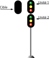 Les autres types de signaux seront revue plus bas. COULEUR L'unité lumineuse de ce type de signal est composé de une, deux ou trois lumières. Chaque lumière ne peut produire qu'une seule couleur, soit rouge, jaune ou vert. L'unité lumineuse est délimité par la cible, c'est-à-dire la plaque