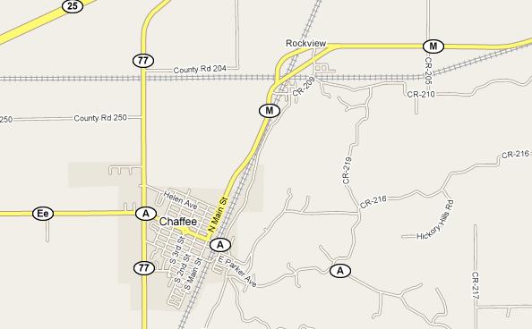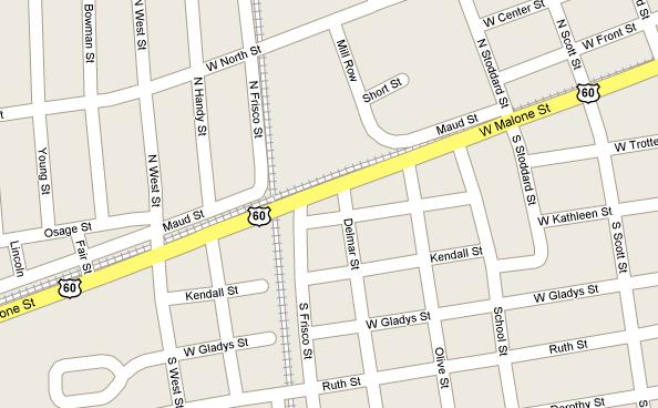 Chaffee and Rockview: Chaffee is a railroad town, there are things all over named for the Frisco Railroad. Such as, Frisco's Bar, Frisco Park, Frisco Avenue, just to name a few. Chaffee is a crew change point on the BNSF between St. Louis and Memphis. As you can see on this map, the diamonds are located directly under the highway bridge at Rockview, a smaller town about a mile north of Chaffee. You can take surface streets to get down by the UP/BNSF Diamonds, park on the street and it's a short walk from there, remember, stay off company property, or at least far enough clear of the tracks as not to bother train crews. Always ask permission first if you encounter a railroad employee. The crew change point isn't hard to find, it's a pinkish building in downtown Chaffee. The UP line just up north of town is busier than the BNSF though. About 80-100 trains pass through on the UP line, and on the BNSF line there is about 5-15. Thanks to Ron Wolfe for a little help on this location.