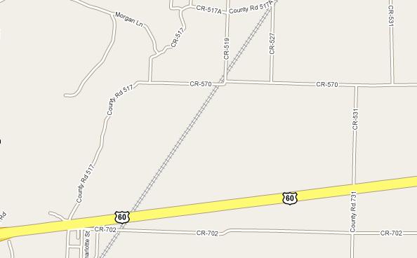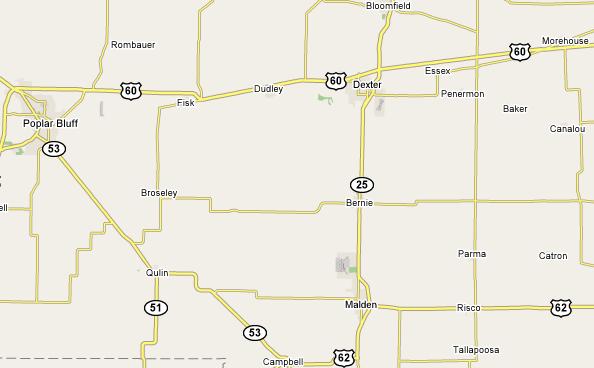 Between Poplar Bluff and Ives on Highways B and 51, you can pace trains easily. However, the track speed is 60, which is 5 mph over the highway speed limit, which is 55. On Highway 25 between Dexter and Bernie, you can pace trains very easily, and the tracks speed is 70, which is 10 over the highway speed limit of 60.
