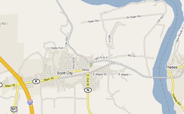 Scott City (Illmo): This town used to have a huge railroading past, there was a beanery that survived due to the railroads, they even hung crew's meals on mail racks where they picked them up at speed just as they would mail! Even a part of the town was named by the railroad (Illmo) for Illinois/Missouri. There was once a large yard that now has 3 or 4 tracks, and the beanery is gone. Now, it's just a wide spot in the (rail)road. There are several crossings with parking and a view (of the tracks). There is the Interstate overpass to hide under for those rain showers (or severe thunderstoms and tornadoes, keep track of your weather forecasts and keep an eye to the sky on days that severe weather is possible) and the hot sun in the summer. East about 2 miles is the huge Thebes Bridge that crosses the Mississippi River. The SEMO Port Railroad also serves Scott City, as well as Motive Rail, both shortlines. About 80-100 trains a day go through on the UP and 1-4 on Motive Rail and SEMO Port Railroad. Amtrak does not service Scott City.