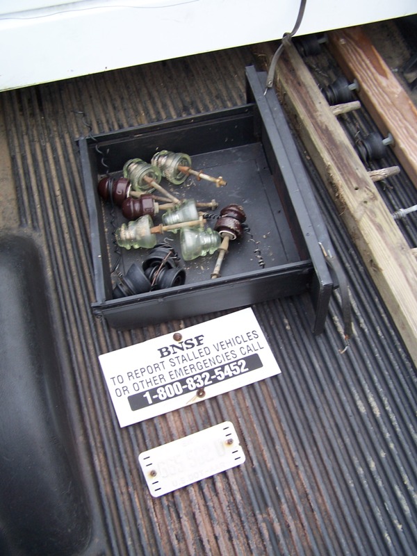 The insulators, some clear glass, some porcelin, and the BNSF crossing post signs I found laying on the ground in the ditch, the screws either still in the post or laying on the ground, so I picked those up, too.