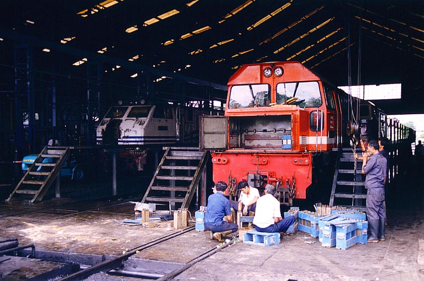 The interior view of Bandung locomotive depot. This BB303 had recently arrived from West Sumatera, being a victim of railway closure at there. And it is nowaday used to haul the new loco-hauled suburban train which replaced the old diesel railcars. A battered CC20306 is being serviced in background, probably a victim of level crossing accident. |