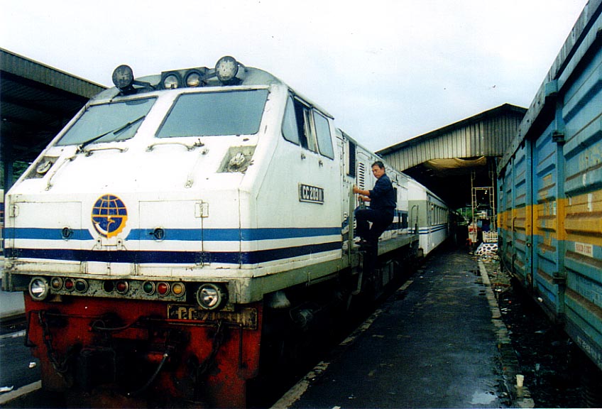 The driver of Argo Gede train climbed onto the cab, ready to drive his CC203 to Jakarta. He is the guy who warn the kid on the above picture to stay away from the driving cab. |