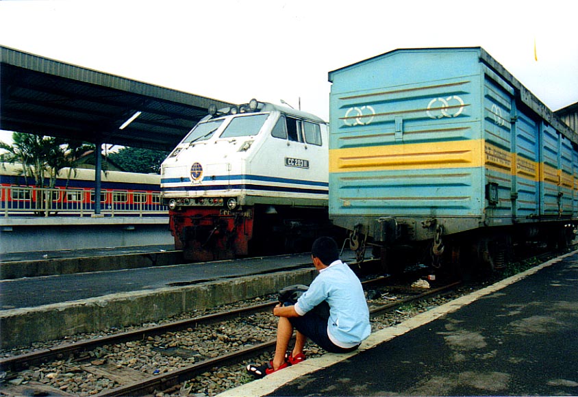 A young boy is looking at the head of Argo Gede train. He's not admiring the train, but he's looking for a free ride (possibly to Jakarta). A few minutes before, I saw him entering the cab of this loco without permission, and got kicked out when the driver spotted him. Maybe he's now looking for another chance. |