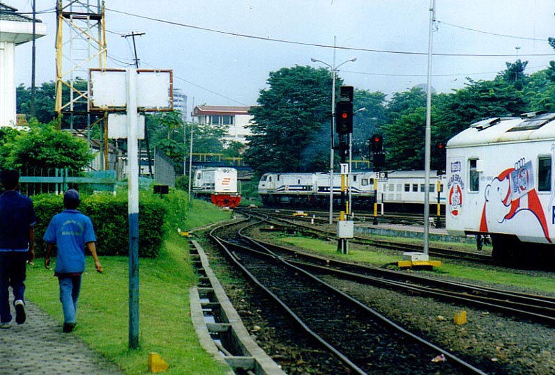 Bandung locomotive depo is used extensively for maintenance purpose in Bandung. Its close vicinity to station building means the station users are exposed to the risk of being hit by locomotives movement accross depo. A group of CC203s and a shunter can be seen on the left. A BB301 is visible on the right. Whereas the diesel railcar in the middle is usually used for government purpose, including presidential duties, as flying to Bandung is sometimes dangerous (due to frequent bad weather). |