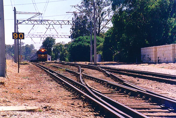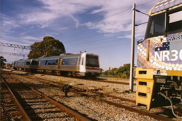 Perth suburban train passed the Indian Pacific train. |