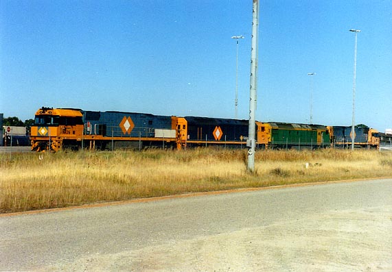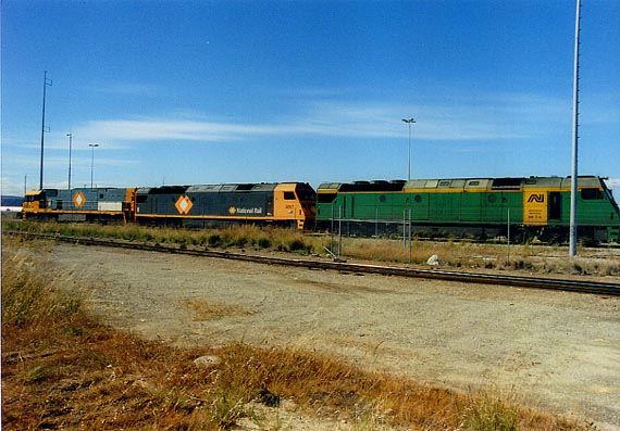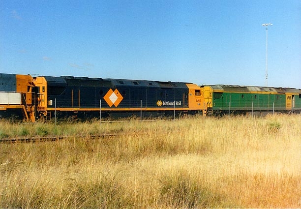 The front view of both AN-class locomotives. The AN on the right is still sporting the old "Australian National" livery, complete with its logo, as the loco used to be owned by the company. Again, sorry if the 'face' of the AN is partially obscured. |