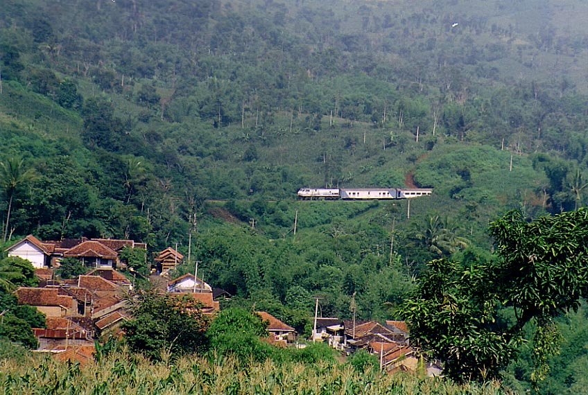 same Lodaya train exiting Lebak Jero Station. The small station complex