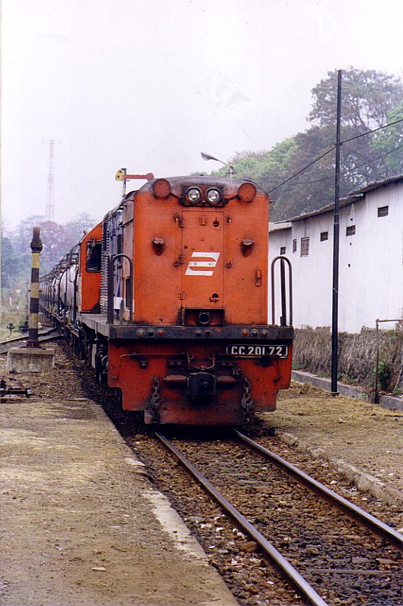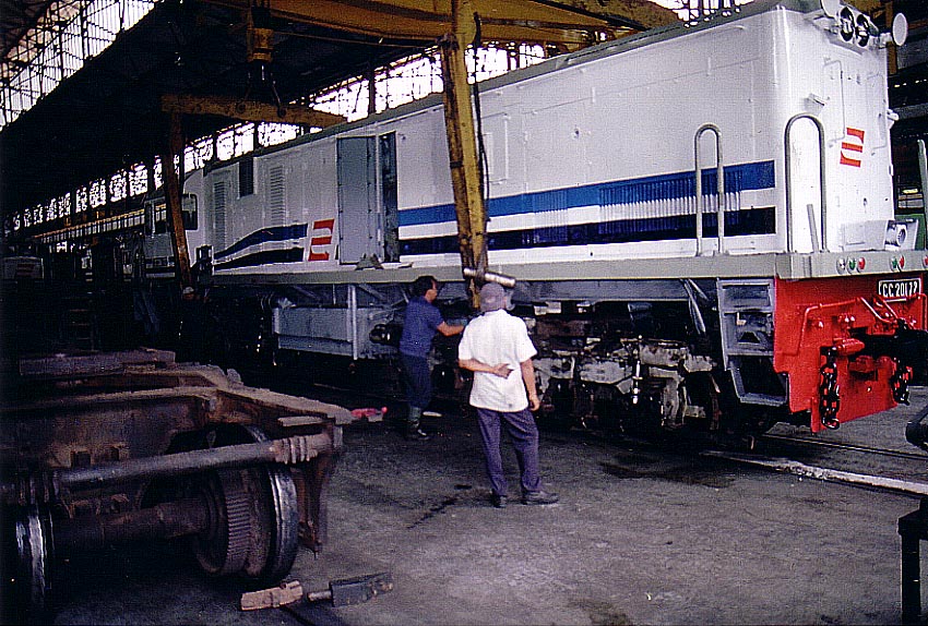 CC20172 is seen being lowered to its bogies in Pengok Workshop, Yogyakarta. The loco have just being overhauled, and it has been converted from general purpose locomotive into an express locomotive. It was previously painted in red. Note the former CC200 bogie on left. |