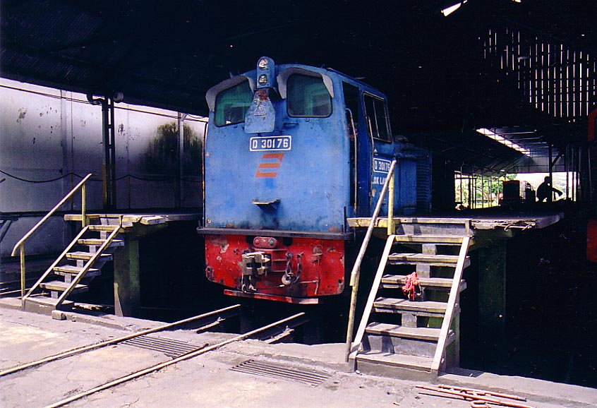 D301 class leader, D30101, is seen stored at Pengok locomotive works. This loco is the first of the rather ubiquitous D301 shunter locomotives. Its last base was in Solo, where it was used for shunting or branchline works to Wonogiri. |