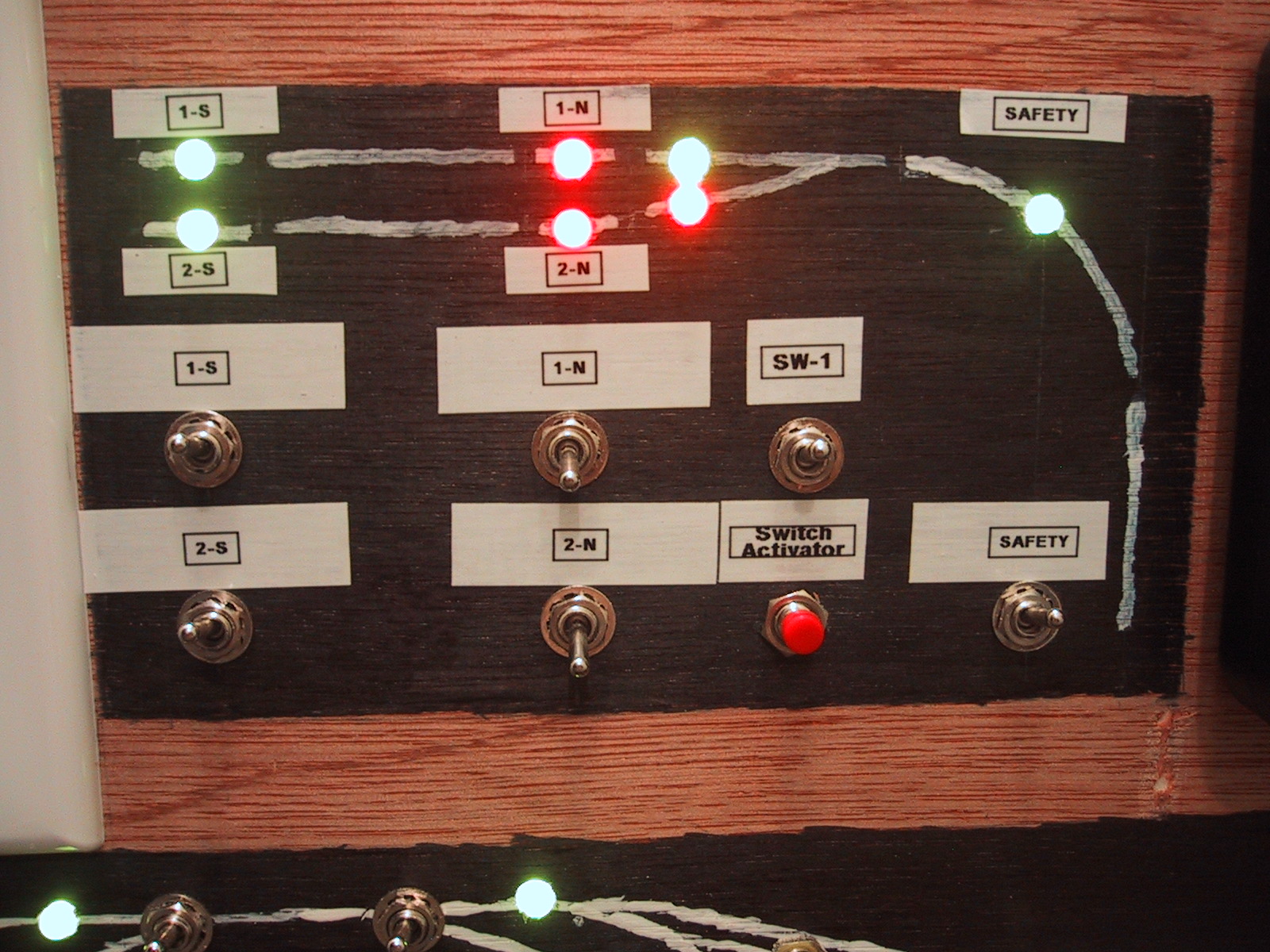 The track diagram shows the individule blocks indicated by the led's. Non led track has power full time. The led's are 2 color (red & green) indicating whether the power is on or off. The safety block in the staging area protects from any train entering or leaving, should a mistake occur.