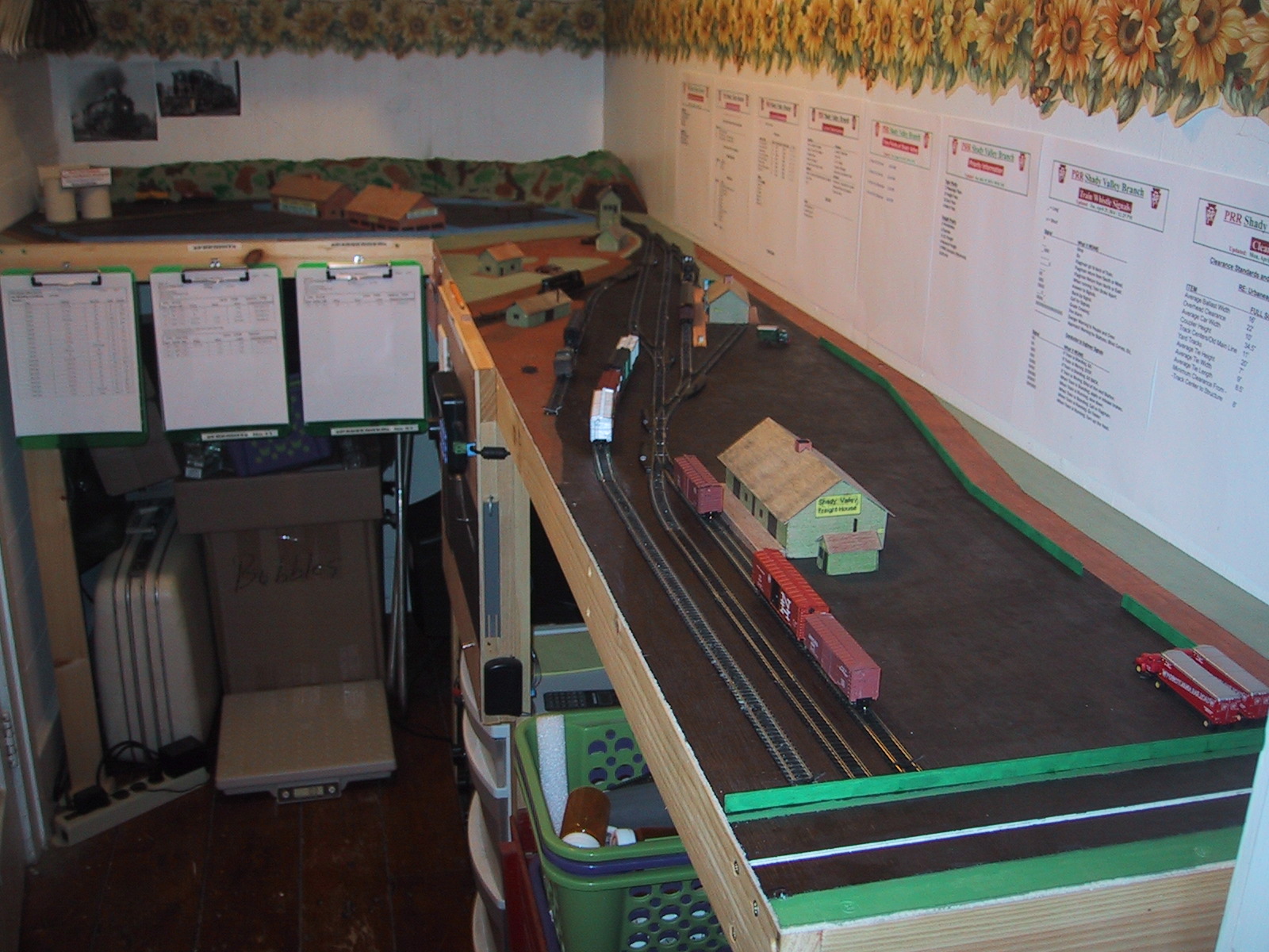 My layout is divided into 2 parts, the Visable part and the Hidden Part. Because of the limited room available, a larger type of operation is out of the question. The Visable part is the village of Shady Valley, the end of the Pennsylvania Railroad branch line. The Hidden part is a 2- track staging yard at Riverside, where the branch joins the main line, beyond the Strawberry Hills tunnel and represents Everyplace Else as well.