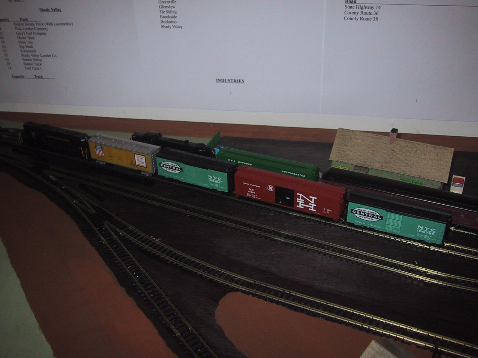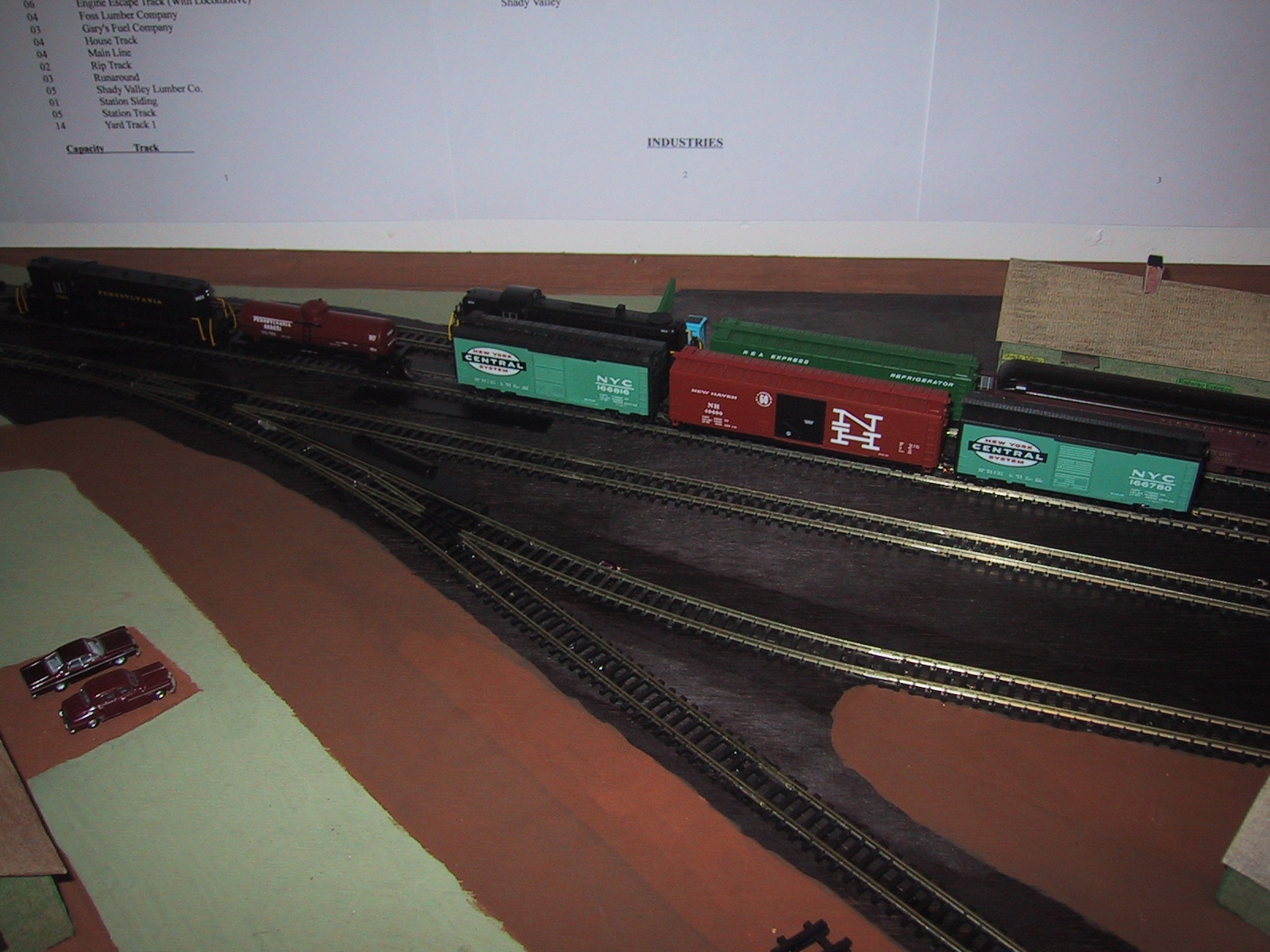 1 Arrival on Shady Valley main track. 2 Pull engine off of the train. 3 Run around the train. 4 Set box car for the Freight House on the escape track. 5 Spot the 2 cars for the House Track. 6 Couple to the car for the Freight House, on the escape track. 7 Spot Freight House car. 8 Lunch Break!