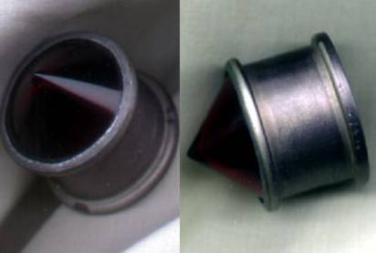 Red roundels with an elongated aluminum holders. On a normal roundel, the aluminum is just a thin rim around one the edge of the glass cone. I understand that these were used during WWII to further narrow the beam cast by searchlight signals so as to better avoid the possibility of rail line attack from enemy aircraft.