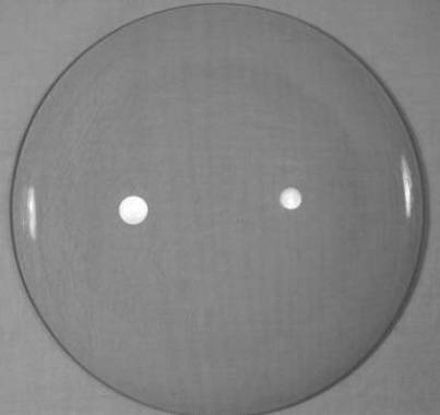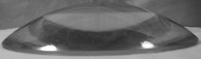 Above. Side and front view of H-2 outer doublet. Solid glass. 8 3/8 inches in diameter and two inches thick.