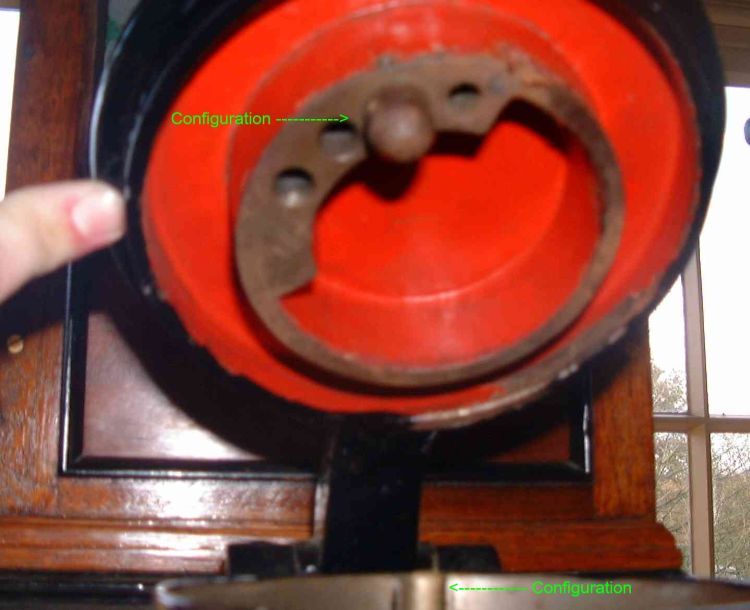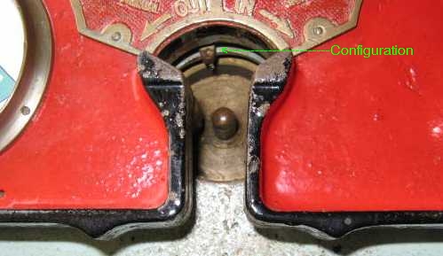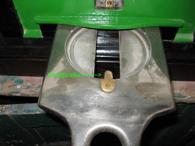 Some tablets have a central hole, some just have a depression in the centre, to aid identification. Being the first design of electric token, the shape of this central hole/depression doesn't necessarily follow the accepted standard that latter tokens adopted. The photo below shows the raised lid of a No 1 Tablet machine, at the bottom of the picture you can just make out the nib which engages with the slot cut in the side of the tablet. On the lid is the pin that engages with the hole in the tablet. In this case the pin is in the 'B' configuration, and shows three other possible positions and room for another.