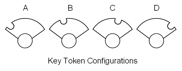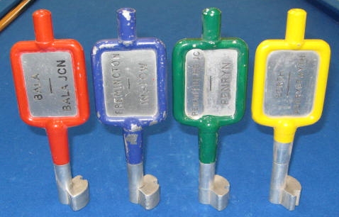 On any single line with more than one token section, it is essential that the tokens of adjoining sections differ in some form or the other. They can be of different shapes, colours and where electric tokens are used, have different configurations of notches etc to only allow them to be used in the correct machine for the section. TYER KEY TOKENS Tyer keys come in a variety of shapes and colours but the feature that distinguishes the key from its neighbours is the slot on the key end. The following is a view from the handle end of a token, showing the relative positions of the slots.