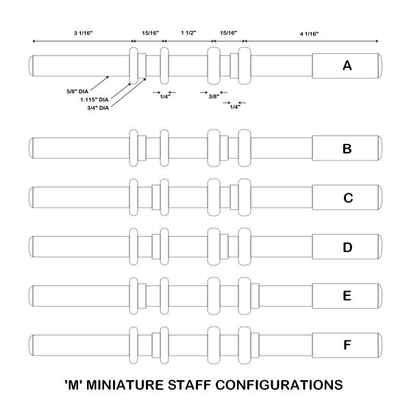 MINIATURE STAFF 'M' TYPE These staffs dispensed with the 5th ring and the configuration is determined by the position of the small collars, to ensure that the staff is inserted the correct way into the instrument one pair of rings are a larger width than the other pair.