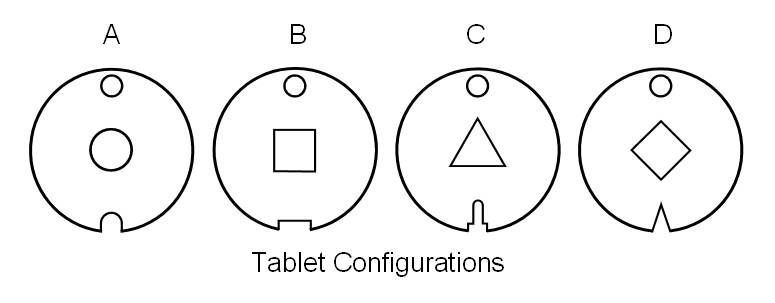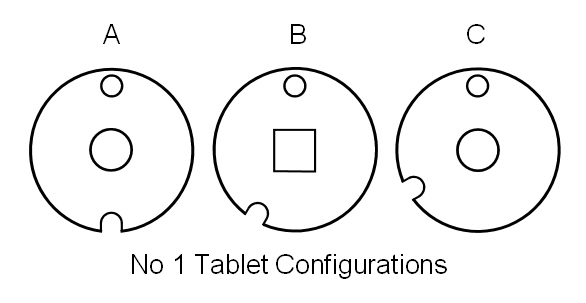 TYER No 1 TABLETS On Tyer No 1 tablets the configuration is determined by the relative position of the slot on the circumference and the small hole. Note - Although I have annotated the sketch below with the configurations A-C, I have found no evidence that this is in fact correct. (If you know the correct annotation, please let me know!)
