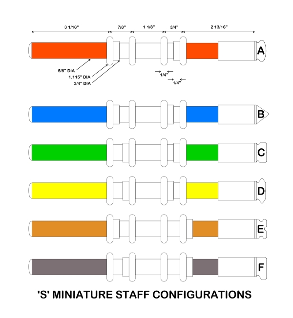 MINIATURE STAFF 'S' TYPE The configuration arrangements are identical to the 'M' type above. To ensure the staffs are inserted into the instrument the correct way, the rings (which are all the same width) are spaced differently.