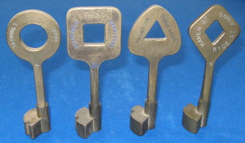 As stated, the slot is what determines the configuration but as an extra aid to identification keys can have additional features. In some cases the key handles are of different shapes and have a central hole, the handle and the hole shapes being 'A' Round, 'B' Square, 'C' Triangular, 'D' Diamond (square turned through 45 degrees).
