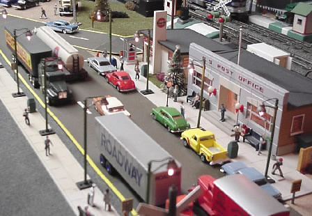 Using Plasticville and 1/64 vehicles, Larry's Main Street scene is typical of