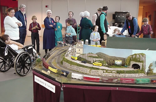 The woman were only mildly interested in our layout until we started to describe making trees out of weeds and small twigs, and brush out of lichen. We also explained making mountains and painting the backdrops. You could see the interest level go up when we started bringing the idea of "family participation" in modeling to our guests.