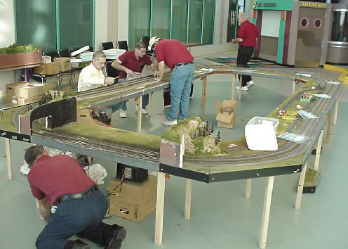 Once the layout is assembled on its' legs, the bridge rails are installed and all of the modules are plugged together.