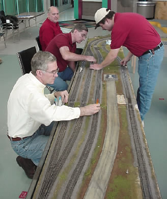 | (Clockwise from near left) Larry Gawlinski, Hank Worrell, Ben Serzo and Jim Oliver fix a little problem with the track alignment. |