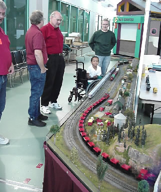 | (clockwise from near left) Rich Raighn, Dave Pierce, Ben Serzo, "Charlie", and Larry Gawlinski watch Rich's tipple-car train run on the layout. |