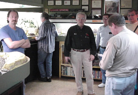 Mert Gardner - (L-R) Larry Diemunsch, Dave Pierce, Mert, Hank Worrell, Ed Claypool, Joe Balcer. Behind Mert are just some of the awards he earned as President of the Mideastern Region of the NMRA. Mert's layout runs all the way around the basement - each area represents a different town or place on the real Denver and Rio Grande Western.