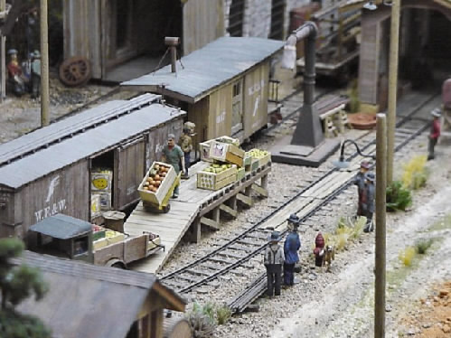 of the loading of a boxcar. Note the label on the box in the boxcar doorway.
