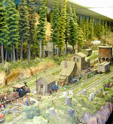 The logging town has its own warehouse and station. All of the trees are built from wire forms and covered in clay, except for the ones cut down in the foreground! |