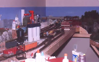 Greg's layout is starting to gather a lot of details. Note the funny high-rise building on the left that looks a lot like a pump spray bottle - boy! what Greg won't think of next! |