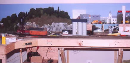 Greg Berndtson - uses photographs and drawings and mock-ups to represent some of the buildings he intends to create. The recently completed freight house is hidden behind the orange reefer. The three gray silos are for the next-to-be-completed industry, the Atlantic Coal Company.