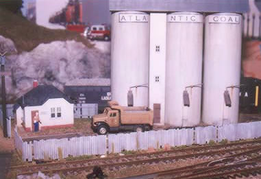 Greg Berndtson - The real silos are made of concrete, but these are PVC pipe. The rest of the structures are modified from the Walther's Goldenflame building set. The dump truck is a Hot Wheels truck that has been shortened and repainted.