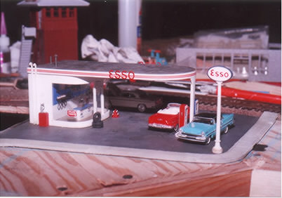 Greg Berndtson - Greg excels at fine details, as this shot of his Esso gas station reveals. There were minor changes made to get the kit to fit better in the space reserved for it. Additional vent pipes were added, and even the correct color for the regular and premium pumps was researched.