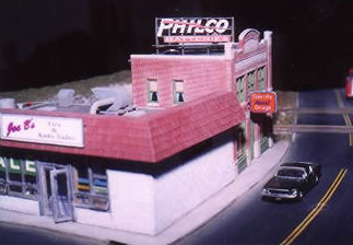 Greg Berndtson - Greg has a great knack for detailing - as the Garrity Drugs building shows. Greg found some neat laser-cut signs in 'N' scale that worked out as a roof sign. Greg is also getting pretty good with scanning in magazine ads on the computer and printing out usable signs.