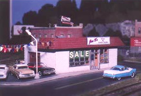 Greg Berndtson - Notice the pennants over the car lot - a nice touch! All of the cars are Johnny Lightning or Racing Champs 1/64 scale vehicles.