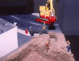 Greg Berndtson - The foundation ground is carved out of the scenery foam, then careful carving and painting is done to create the "dug earth" scene. Perhaps it looks realistic because Greg uses sifted dirt as the actual ground cover. Now how much more realistic can you get?