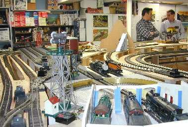 Pat Bigley - A view from behind the roundhouse at the bottom of the 'L' to the middle of the other wing of the layout. Pat (left) and SJSG member Hank Worrell are still discussing track angles. Pat as settled on Gargraves track throughout and a collection of Flyer and Gargraves turnouts.