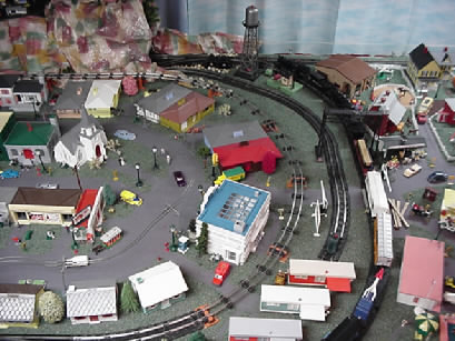 Michael McConnell - The long leg of the L-shaped layout is mostly city, but I do have a section of suburbia (the six Plasticville Ranch houses in the middle - one of each color!) The two sidings separate the city from the "rural" country.