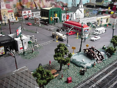 Michael McConnell - Downtown city streets come together with two automatic MTH street light sets controlling traffic. I have yet to make those trolley drivers pay any attention to them. All of the buildings, street lights and billboards are illuminated. Turning off the room lights and running the trains "in the dark" is one of my favorite tricks, especially with a lighted passenger train snaking around the layout.